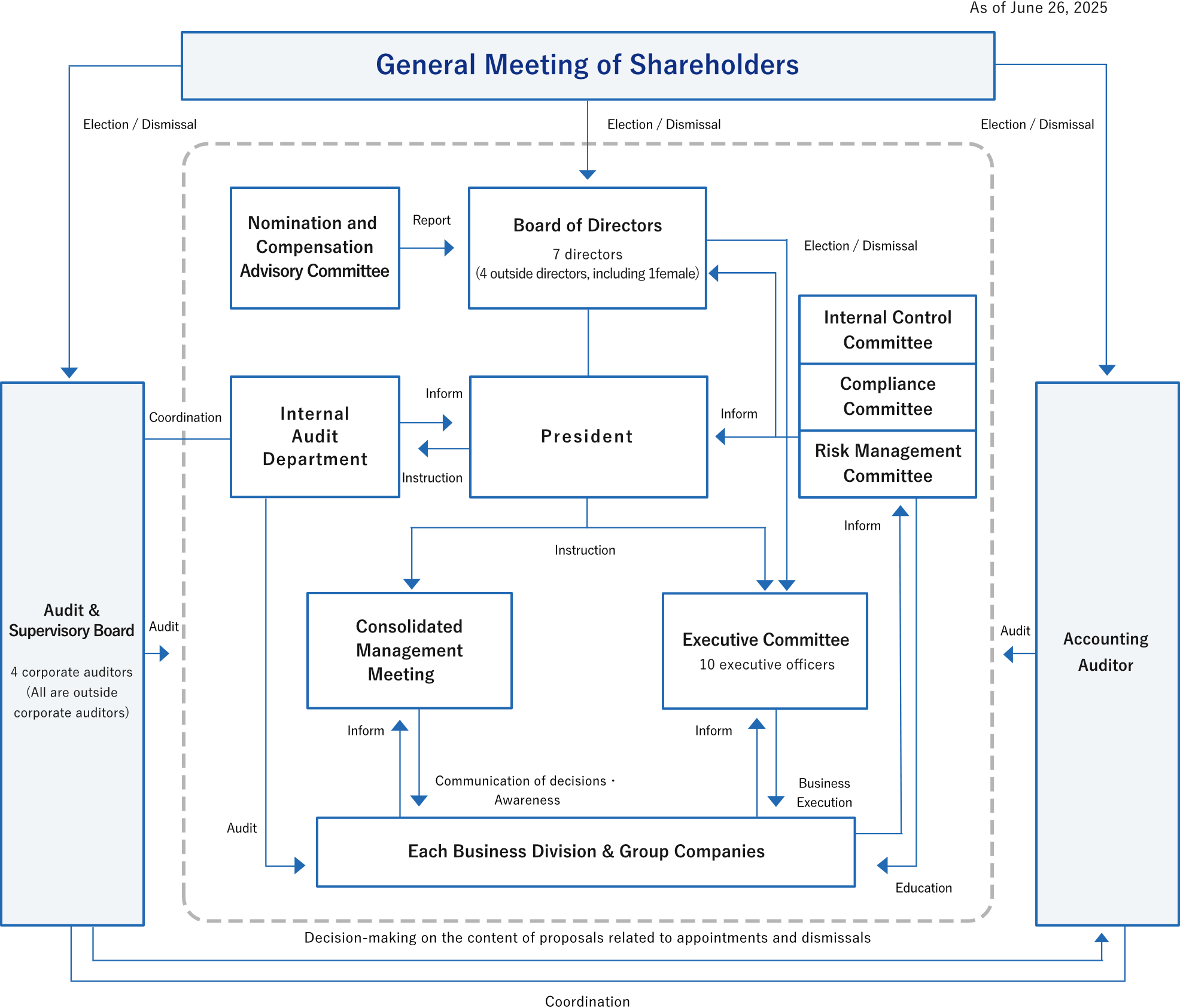 Our group is aware of our responsibilities to all its shareholders and stakeholders and is committed to transparent and honest management. We are working to strengthen and enhance corporate governance based on our basic approach of responding to social demands through prompt and decisive decision-making, improving corporate value, and increasing our reason for existing in society while adhering to an autonomous governance system that centers on the Board of Directors with fully functioning internal control, risk management, compliance, and disclosure control.